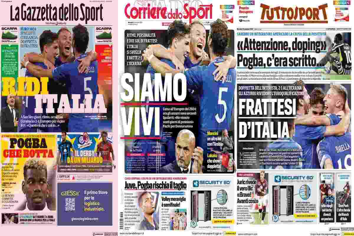 Aperture dei quotidiani italiani che celebrano la prima vittoria di Spalletti sulla panchina della Nazionale. “Ridi Italia” è il titolo della ‘Gazzetta dello Sport’. In basso, spazio per la vicenda Pogba che tiene banco: “Pogba, che botta“. Il francese rischia una squalifica lunghissima e la Juventus si prepara a rescindergli il contratto.