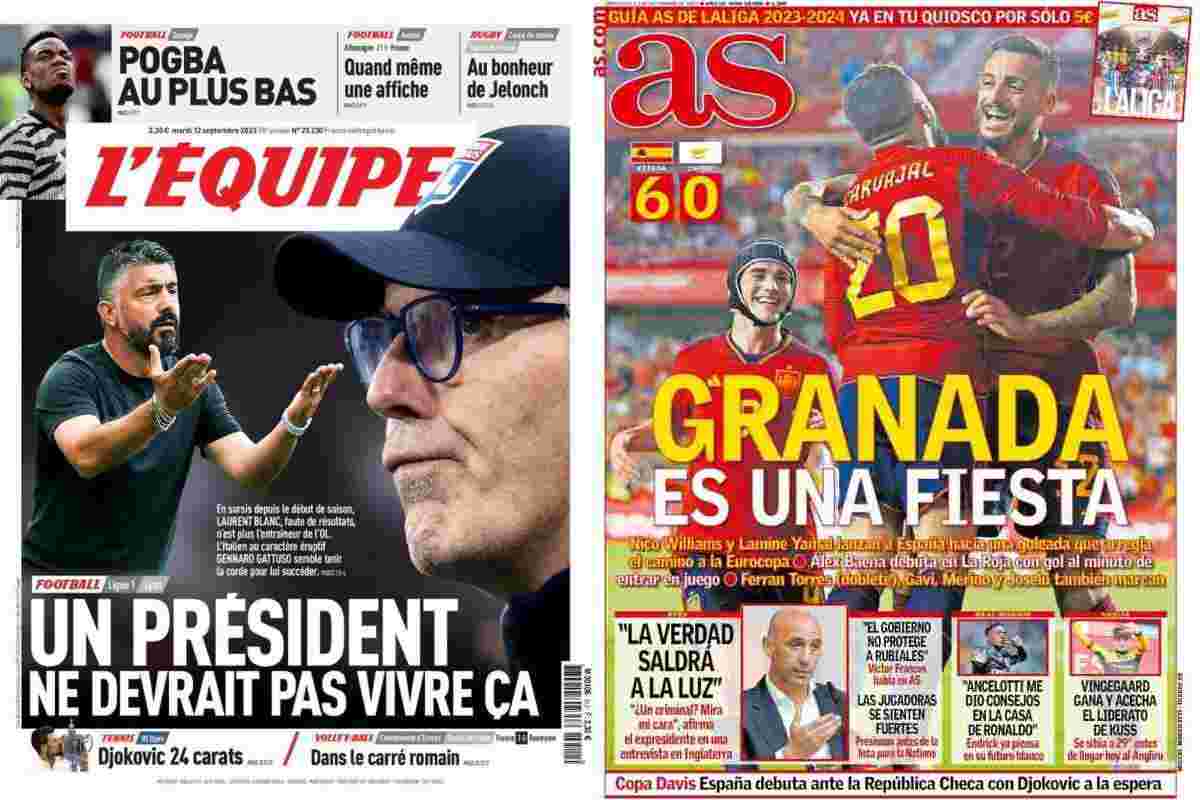 In Francia, cambio in panchina all’Olympique Lione: “Un president ne devrait vivre ça“, su ‘L’Equipe’, con il volto di Gattuso che campeggia in prima pagina pronto a subentrare a Blanc. Nel frattempo, la Spagna si diverte in campo e rifila altre sei reti a Cipro dopo i sette gol alla Georgia: “Granada es una fiesta“, come titola ‘As’.