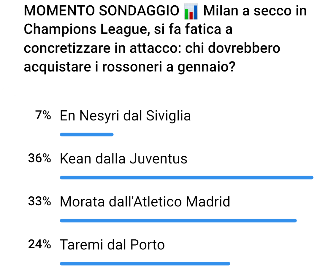 Tra questi, ad esempio, rientrava Moise Kean, centravanti della Juventus corteggiato proprio dai rossoneri. Nel sondaggio lanciato quest’oggi sul canale Telegram di Calciomercato.it, l’attaccante italiano è stato il più votato con il 36% delle preferenze dei nostri utenti come possibile rinforzo del Milan per il mercato di gennaio. Ad occupare il secondo gradino del podio Alvaro Morata con il 33%, davanti a Mehdi Taremi del Porto al 24% e Youssef En-Nesyri del Siviglia al 7%.