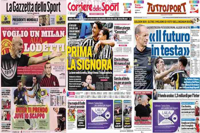 Il titolo in apertura del Corriere dello Sport: “Prima la Signora”. A Reggio Emilia i bianconeri possono tornare in testa dopo 3 anni. La Juve vede la vetta, Allegri frena: troppa euforia. Il Milan piange ‘Ceramica’. Ciro in difesa: Mi manca il gol. Garcia al bivio: tre per un posto. Una magia di Oudin, il Lecce è secondo.