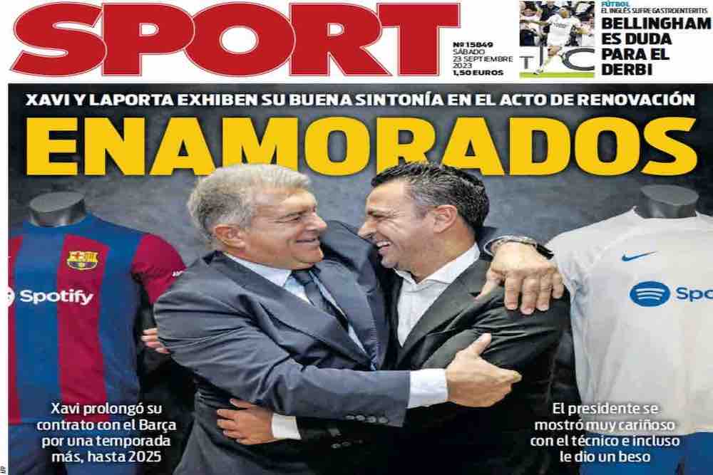 La prima pagina di Sport: “Enamorados”, si legge sul quotidiano catalano che si sofferma sul rinnovo di Xavi fino al 2025 sulla panchina del Barcellona. Marca invece si sofferma sulle condizioni di Bellingham, che preoccupano Ancelotti: l’asso del Real Madrid è in dubbio per il derby con l’Atletico.
