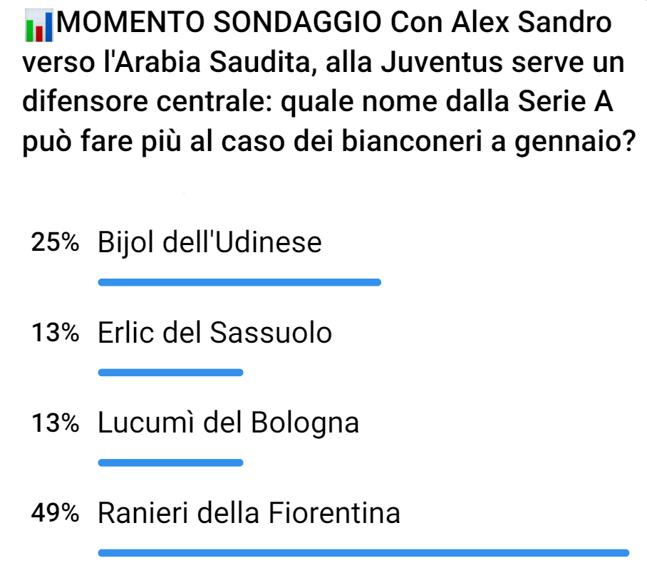 A trionfare è stato uno degli uomini più in forma della Fiorentina, mancino proprio come il brasiliano. Si tratta di Luca Ranieri, centrale molto duttile e adattabile a terzino sinistro come lo stesso Alex Sandro. Il difensore viola, che nell’ultimo turno di Conference League ha messo a segno una doppietta, è stato votato dal 49% dei tifosi su Telegram. Alle sue spalle un altro prospetto interessante come Bijol, difensore sloveno di proprietà dell’Udinese. Agli ultimi due posti perfetta parità di voti tra Erlic del Sassuolo e Lucumì del Bologna entrambi fermi al 13% delle preferenze.