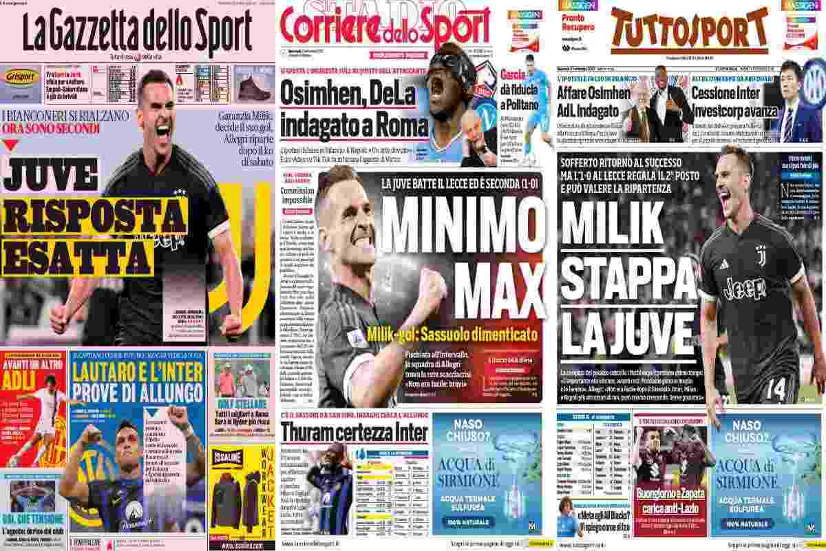 Su ‘Tuttosport’, “Milik stappa la Juve“, con il polacco autore del gol vittoria in risalto. In alto, spazio alle vicende del Napoli: “Affare Osimhen, Adl indagato” e dell’Inter: “Cessione Inter, Investcorp avanza“.
