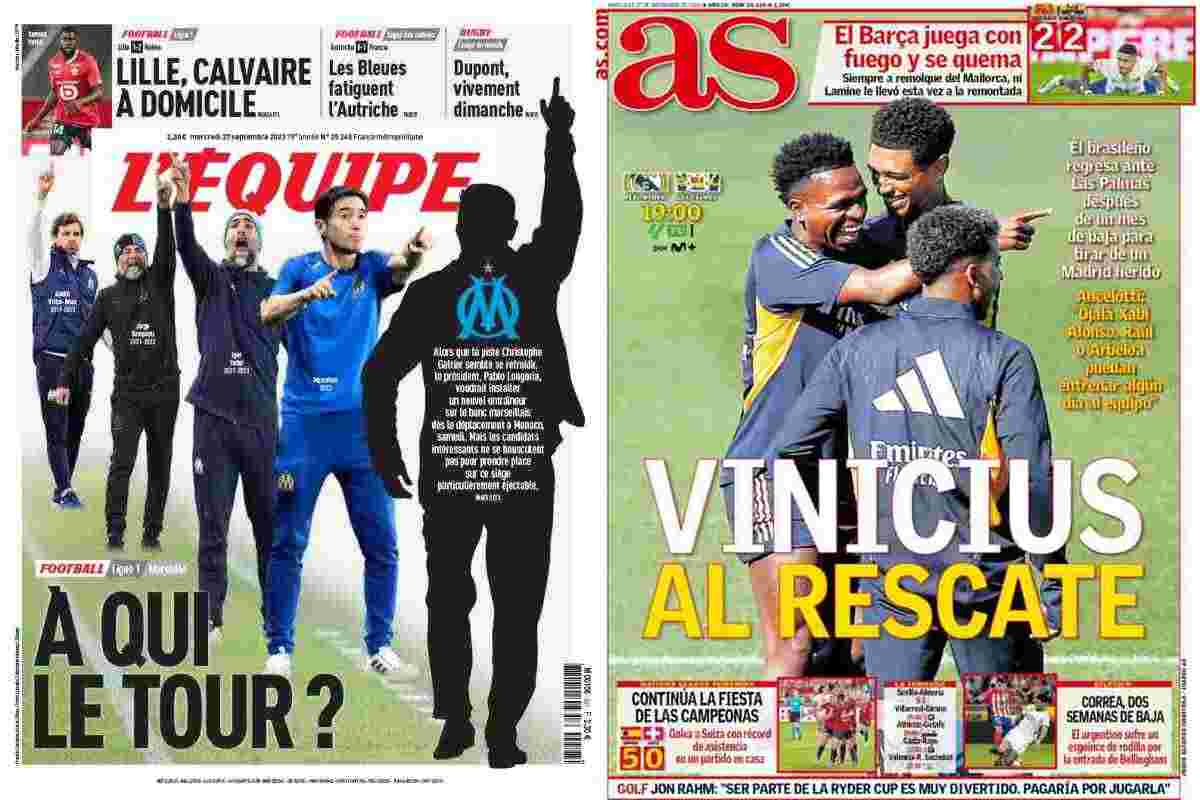 “A qui le tour?” è il titolo de ‘L’Equipe’, con il giallo su chi erediterà la panchina del Marsiglia. Mentre in Spagna, su ‘As’, il Real Madrid si prepara a riabbracciare il suo giocatore forse più decisivo: “Vinicius al rescate“.