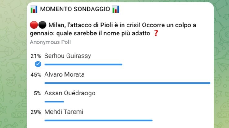 Per questo motivo abbiamo chiesto nel sondaggio pubblicato sul nostro canale Telegram quale sarebbe per il Milan il miglior acquisto in attacco a gennaio.