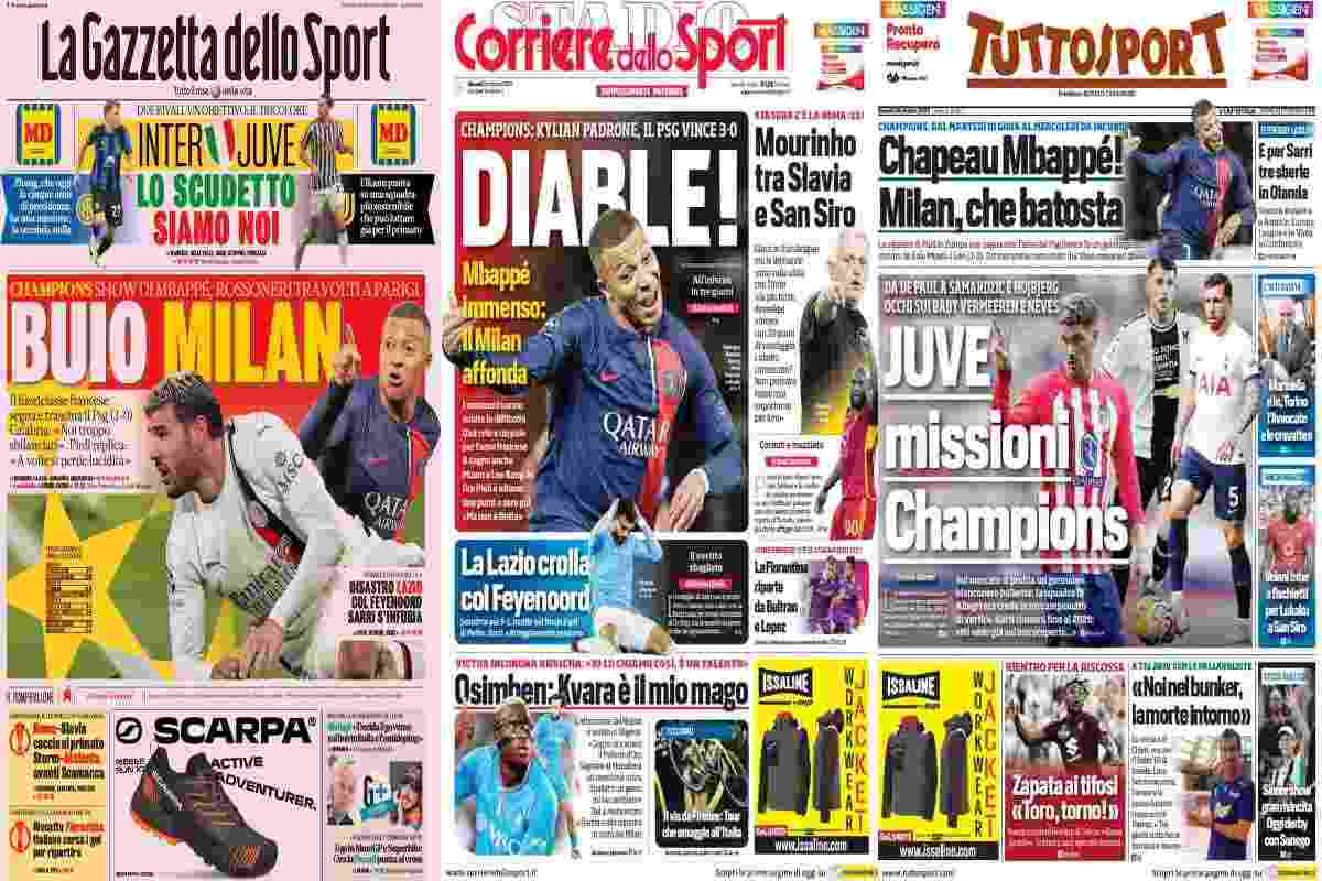 La serata di Champions League tiene banco, con la pesante sconfitta del Milan in casa del Psg che mette in salita la strada europea del Diavolo. “Buio Milan” è il titolo della ‘Gazzetta dello Sport’. Perde anche la Lazio: “Disastro Lazio col Feyenoord, Sarri si infuria“. In alto, la riproposizione del ‘derby d’Italia’: “Inter-Juve, lo scudetto siamo noi“.