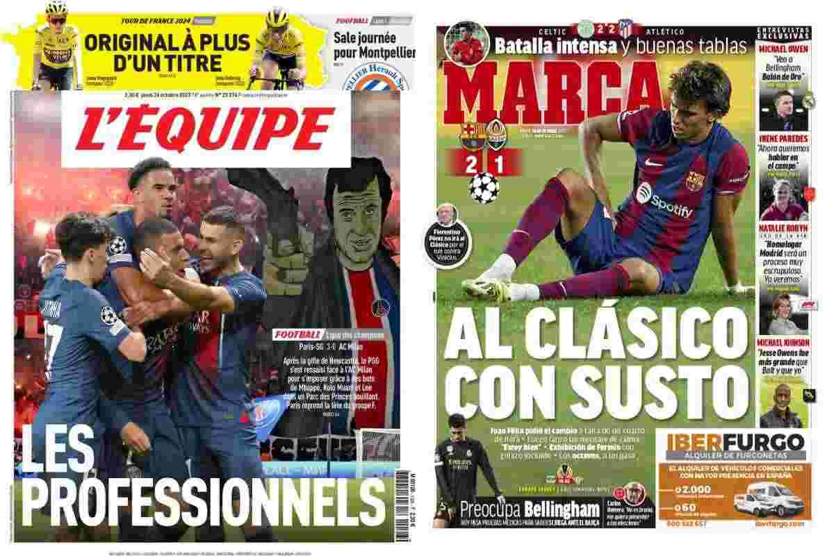 In Francia, ‘L’Equipe’ esalta, ovviamente, la vittoria del Psg sul Milan: “Les professionels“. In Spagna, ‘Marca’ guarda al ‘Clasico’ imminente tra Barcellona e Real Madrid con entrambe le squadre preoccupate: “Al Clasico con susto“. In prima pagina, i volti sofferenti di Joao Felix e Bellingham, alle prese con problemi fisici.