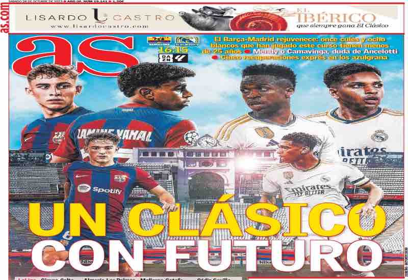 “Un Clasico con futuro”, questo il titolo sulla prima pagina del quotidiano AS sulla sfida odierna tra le due grandi rivali del calcio spagnolo. “Rolling Barça” è invece l’apertura del Mundo Deportivo: la squadra di Xavi punta al sorpasso in classifica sui ‘Blancos’ di Ancelotti.
