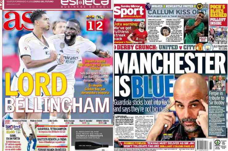 L’inglese si prende la scena su AS che titolo: “Lord Bellingham”. Marca, invece, apre a tutta pagina con il titolo: “Bellingham saca la lengua”. In Inghilterra, invece, riflettori puntati sul derby di Manchester con le pagine sportive del Mirror che aprono con il titolo: “Manchester is Blue”.