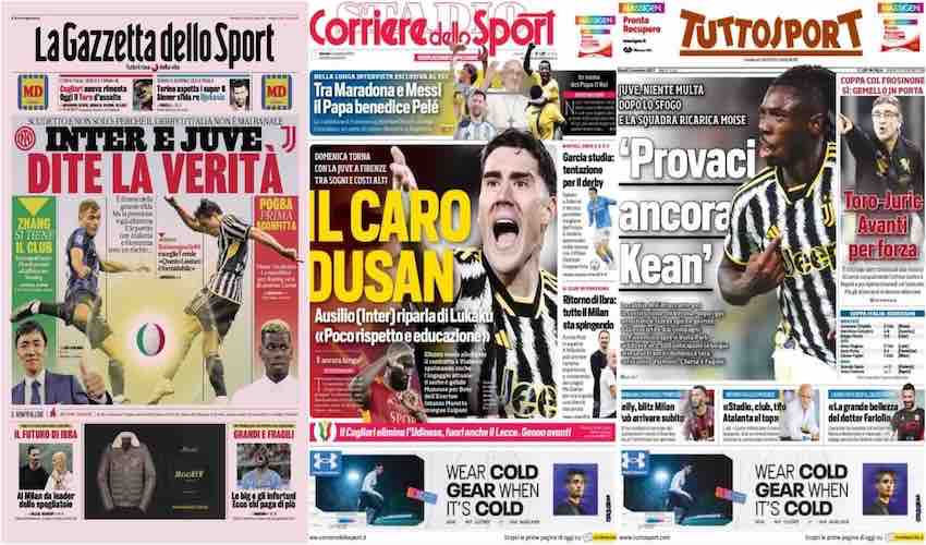 “Il Caro Dusan”, così apre il Corriere dello Sport. Domenica torna con la Juve a Firenze tra sogni e costi alti. Ausilio riparla di Lukaku: “Poco rispetto ed educazione”. Garcia studia la tentazione per il derby. Ritorno di Ibra: tutto il Milan sta spingendo. Tra Maradona e Messi il Papa benedice Pelè.