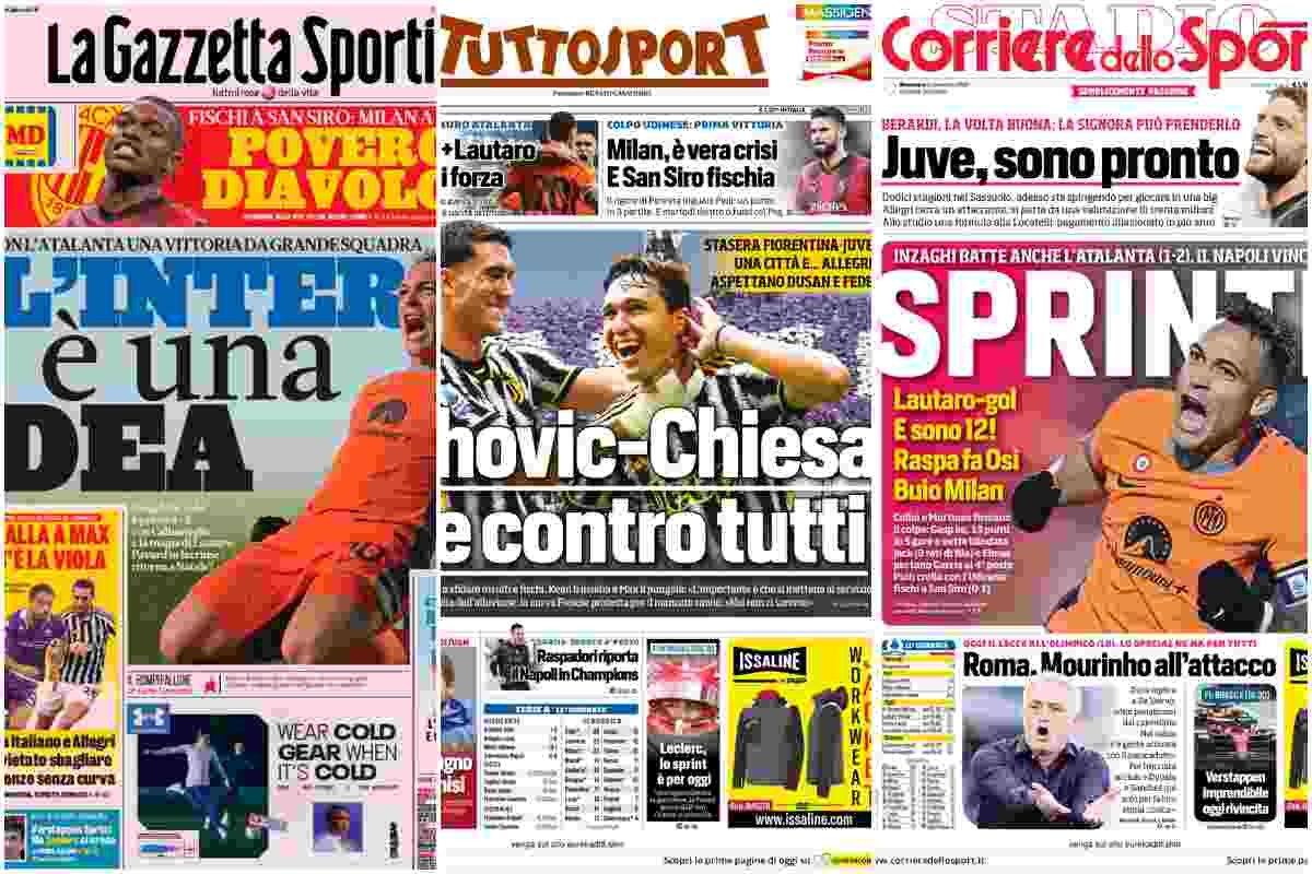 La Gazzetta dello Sport dedica la prima pagina alla pesantissima vittoria dei nerazzurri in casa dell’Atalanta: “L’INTER È UNA DEA”. Il taglio alto, invece, se lo prende tutto la clamorosa sconfitta del Milan contro l’Udinese: “Povero Diavolo”. Spazio anche per la vittoria dei partenopei: “Raspadori vola e il Napoli è quarto”. Infine, un richiamo al big match di questa sera: “Palla a Max, c’è la Viola”.