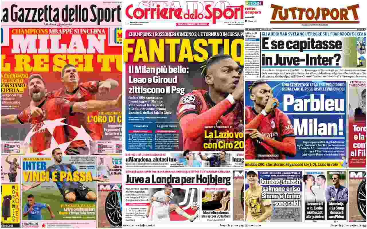 La prima pagina de La Gazzetta dello Sport è dedicata alla grande notte dei rossoneri: “MILAN IL RE SEI TU”. Spazio anche alla vittoria della Lazio: “L’oro di Ciro“. Gli altri titoli di giornata: “Inter, vinci e passa“; “Capello, Juve perché non subire gol è un gran valore”; “Kvara con Raspadori, Napoli l’Union fa la forza”.