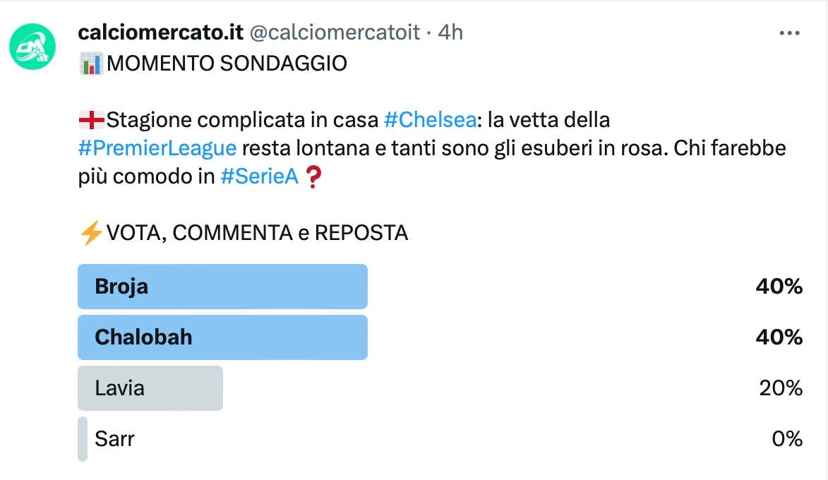 Broja e Chalobah sono i colpi da mettere a segno dal Chelsea per una delle big del nostro campionato. Entrambi arrivano al 40% di voti, mentre Lavia si ferma al 20%. Nessuno indica in Sarr l’uomo giusto per rinforzare una delle compagini della Serie A.