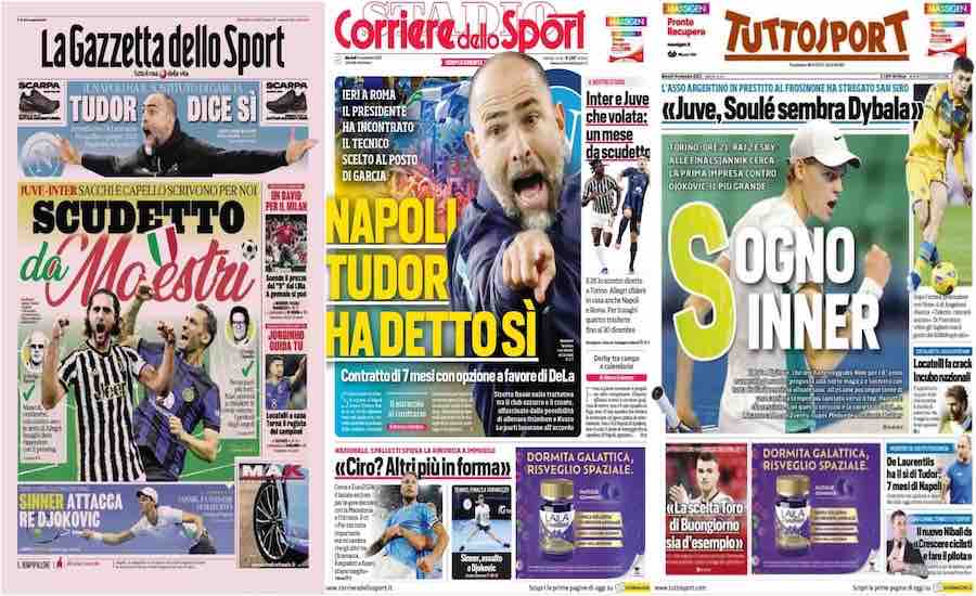 I titoli principali sul Corriere dello Sport: “Napoli, Tudor ha detto sì”. Contratto di 7 mesi con opzione a favore di DeLa. Inter e Juve che volata: un mese da scudetto. “Ciro? Altri più in forma”, Spalletti spiega la rinuncia a Immobile. Sinner, assalto a Djokovic.