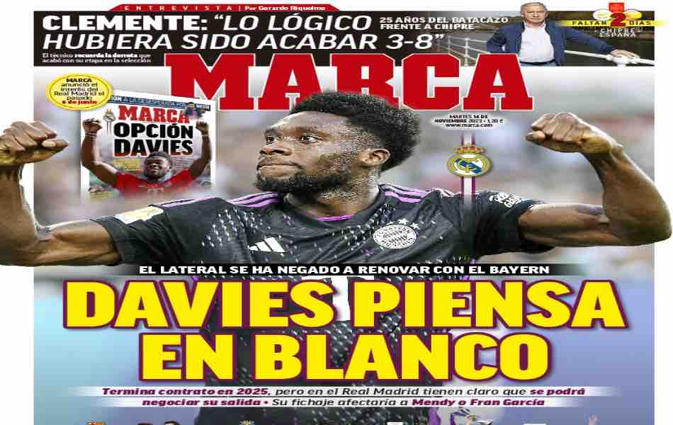 Spazio al mercato sulle colonne di Marca: “Davies piensa en blanco”, il Real Madrid in pressing sul terzino canadese del Bayern Monaco. Zaire-Emery è la novità della Francia per le prossime gare delle qualificazioni ad Euro 2024 “Petit de bleu Clairefontaine”, titola il quotidiano L’Equipe.