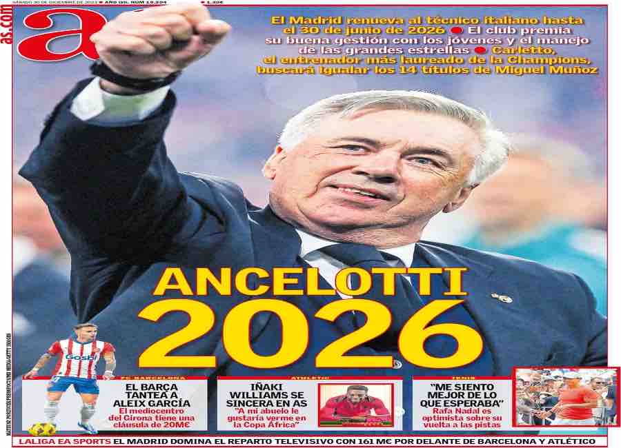 Il quotidiano AS apre con il rinnovo di Carlo Ancelotti e la firma con il Real Madrid: “Ancelotti 2026”. Mentre Vitor Roque si presenta al Barcellona: “La Champions es mi sueño”, titola il Mundo Deportivo.