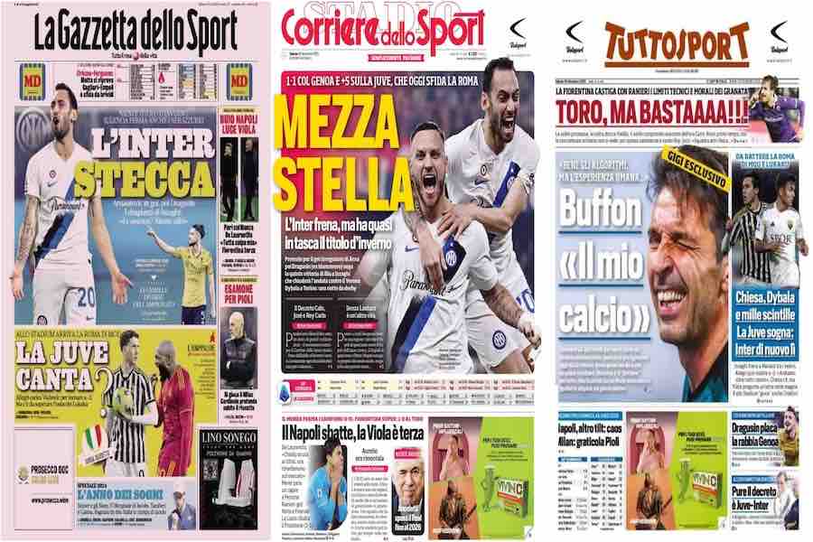 Così apre il Corriere dello Sport: “Mezza stella”. L’Inter frena, ma ha quasi in tasca il titolo d’inverno. Nerazzurri a +5 sulla Juventus che stasera sfida la Roma. Il Napoli sbatte, la Viola è terza. Ancelotti sfida il Real fino al 2026.