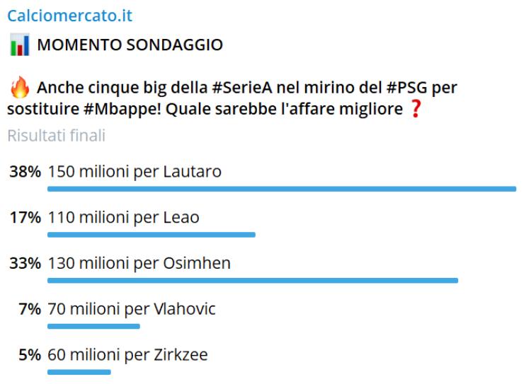 “Quale sarebbe l’affare migliore” per sostituire Mbappe?, abbiamo chiesto ai nostri utenti. L’opzione più votata, col 38%, è stata quella “150 milioni per Lautaro”. Poco dietro, “130 milioni per Osimhen”. Terza “110 milioni per Leao; quarta ma scarsamente votata “70 milioni per Vlahovic”. Ancor meno, quinta ed ultimissima, “60 milioni per Zirkzee”.