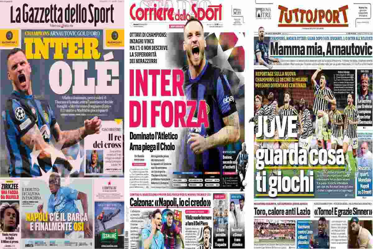 Quotidiani italiani che naturalmente celebrano la vittoria dell’Inter in Champions contro l’Atletico Madrid. La ‘Gazzetta dello Sport’ apre con “Inter Olè“. Stasera tocca all’ultima italiana impegnata: “Napoli, c’è il Barça e finalmente Osi“.