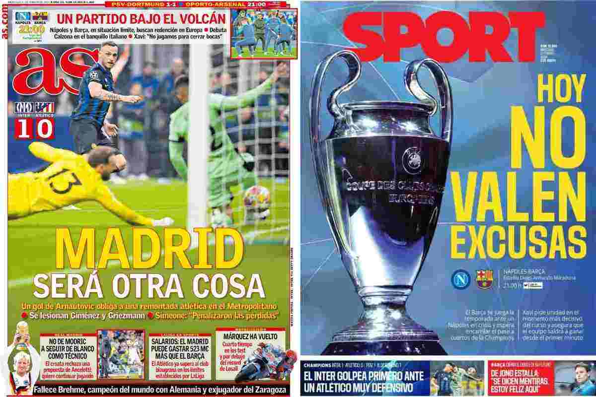 ‘As’ prova a dare coraggio ai ‘Colchoneros’, dopo la sconfitta di San Siro in cui l’Inter è stata superiore: “A Madrid serà otra cosa“. Su ‘Sport’, invece, si suona la carica per il Barça in crisi dell’ultimo periodo: “Hoy no valen excusas“.