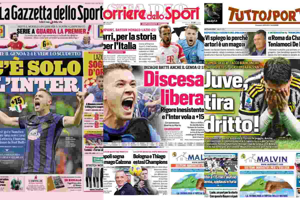 La Gazzetta dello Sport titola con ‘C’è solo l’Inter’ dopo la vittoria di ieri sera sul Genoa per 2-1 che significa +15 sulla Juve seconda e scudetto ormai praticamente in cassaforte. In taglio alto ‘Serie A, guarda la Premier!’ in relazione alla eventuale scissione della Lega Serie A dalla Figc. Di spalla ‘Lazio, sogni d’oro’ con la sfida di ritorno col Bayern Monaco prevista stasera. Ai biancocelesti basterebbe un pareggio per compiere l’impresa e approdare ai quarti. Ancora di spalla ‘Bologna ppiù ricco e felice. Tomba: “Torno allo stadio”.