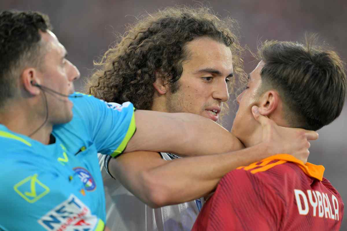 Il derby della capitale si scalda. La Lazio deve urgentemente recuperare il risultato, i nervi di certo non possono essere saldissimi. E così basta poco per farli saltare, anche per pochi secondi. Protagonisti sono Matteo Guendouzi e Paulo Dybala, che scherza un po’ con il francese dicendogli qualcosa dopo che il pallone era uscito. L’ex OM non gradisce e la reazione è immediata, così i due vengono a contatto con le mani che si alzano un po’ troppo. Subito l’intervento dei compagni, si accende una scaramuccia in campo che per fortuna viene sedata dopo pochi secondi da Guida e da qualche altro giocatore in campo. Con De Rossi che non gradisce la mancanza di provvedimenti.