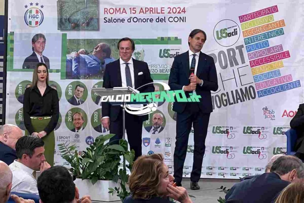 Nella prestigiosa cornice del Salone d’Onore del Coni, è andata in scena la 13esima edizione del Premio Enzo Bearzot, ormai prestigioso riconoscimento del calcio italiano, organizzato dall’US Acli. A trionfare quest’anno è stato Simone Inzaghi, che succede così a Luciano Spalletti campione d’Italia nella scorsa stagione. A ricevere il premio oggi sono stati anche Matteo Marcenaro, come miglior giovane arbitro, e Livio Berruti alla carriera. Una cerimonia a cui hanno partecipato le istituzioni sportive e calcistiche come Gabriele Gravina, Giovanni Malagò, Carlo Pacifici, ma anche Beppe Marotta, seduto accanto a Inzaghi. E poi anche Angelo Di Livio e Fulvio Collovati.