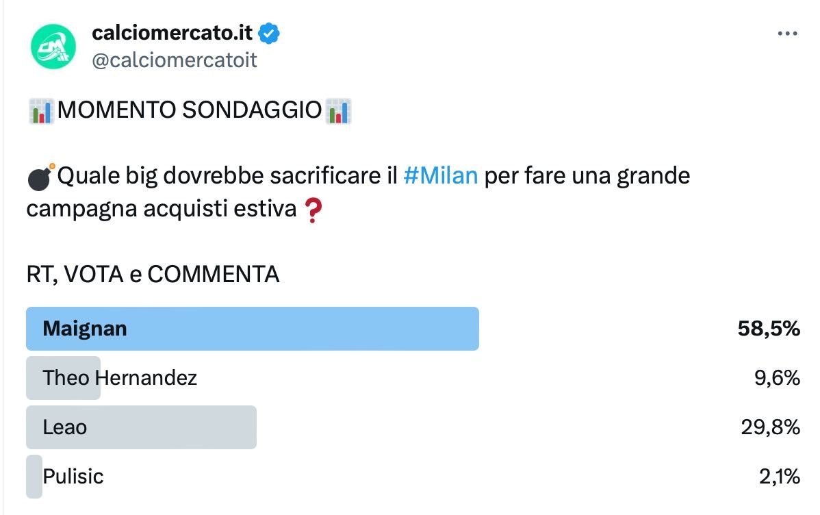 Il prescelto è Mike Maignan, non certo alla sua migliore stagione italiana, che ha raccolto il 58,5% di voti. Dietro di lui c’è Leao, un altro di quelli che ha deluso quest’anno, con il 29,8%. Pochi, invece, quelli che metterebbero sul mercato Theo Hernandez: appena il 9,6% di preferenze sono andate al terzino francese. Ancora meno quelli che pensano a Pulisic come sacrificato eccellente (2,1%): del resto l’americano è stato tra le note liete di quest’anno, tenendo spesso a galla con i suoi gol la squadra di Pioli.