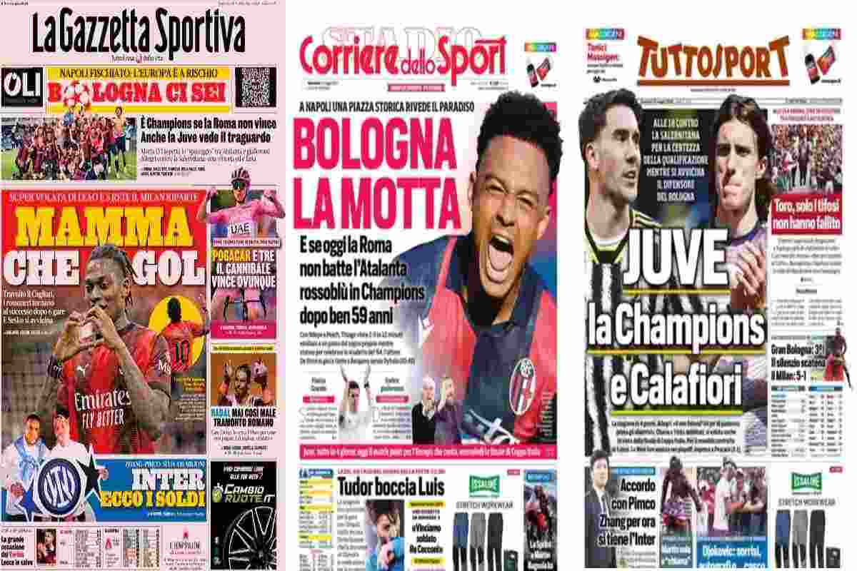 “Mamma che gol” è il titolo principale della ‘Gazzetta dello Sport’, dedicato alla goleada del Milan, 5-1 al Cagliari. In alto, spazio all’impresa del Bologna, vicinissimo alla Champions aritmetica dopo la vittoria a Napoli: “Bologna, ci sei“.