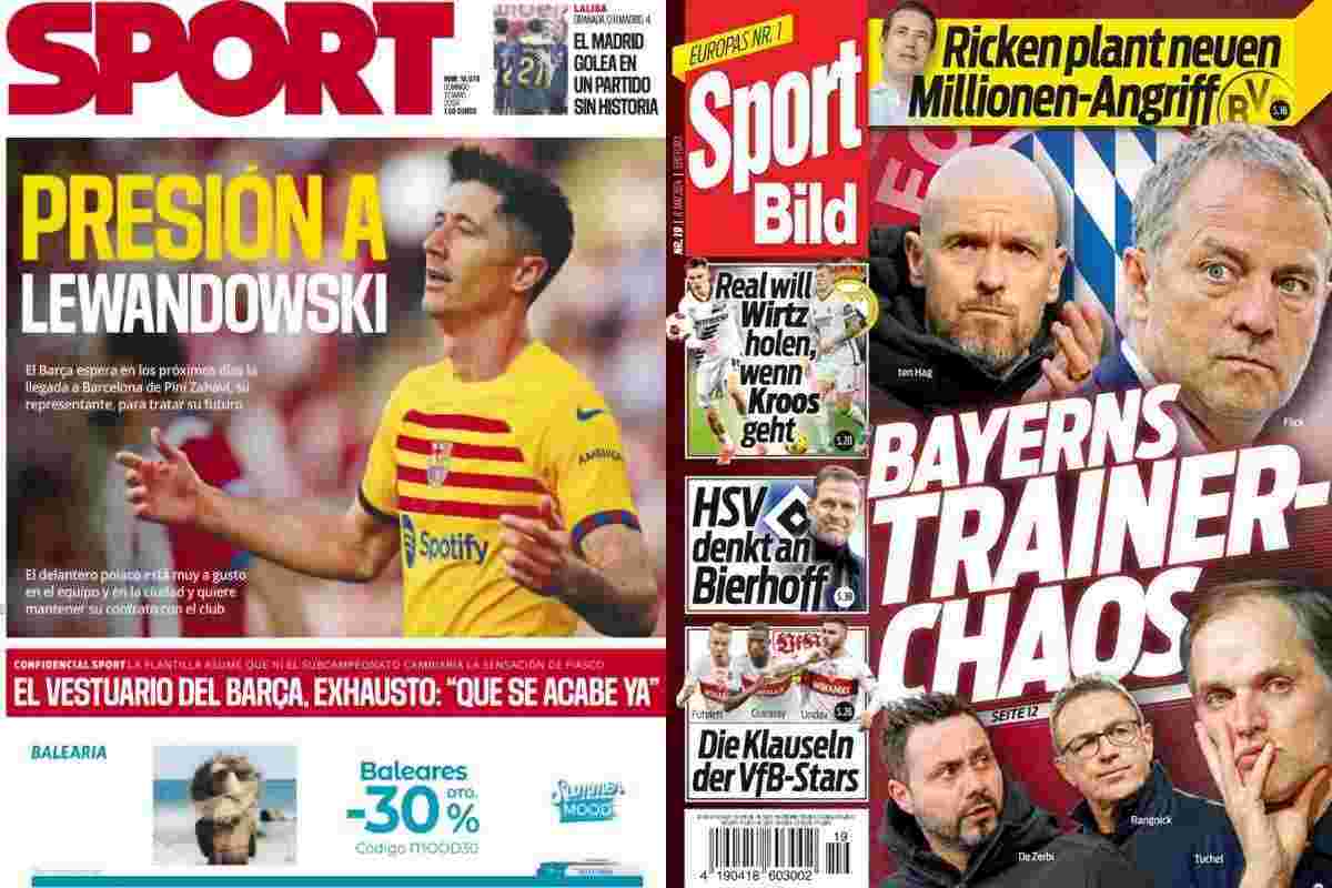 In Spagna, su ‘Sport’, si parla del futuro del bomber principe del Barcellona, con l’agente atteso in città per prendere una decisione: “Presion a Lewandowski“. In Germania, invece, è alta tensione per la panchina del Bayern Monaco: “Bayerns trainer-chaos“, si legge sulla ‘Bild’, con i volti di Ten Hag, Flick, De Zerbi, Rangnick e Tuchel in prima pagina. Come andrà a finire?