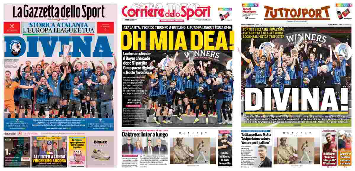 La prima pagina della Gazzetta dello Sport: “Divina”. Storica Atalanta, l’Europa League è tua. In taglio basso, spazio al futuro societario dell’Inter con l’approdo di Oaktree a capo del club: “All’Inter a lungo, vinceremo ancora”
