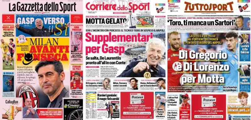 La prima pagina della Gazzetta dello Sport: ”Milan avanti Fonseca”. I rossoneri hanno scelto: in pochi giorni si può chiudere”. Pioli saluta San Siro: c’è Napoli nel futuro? Gasp verso il sì. Nuova Juve per Motta: subito Zirkzee e Di Gregorio.
