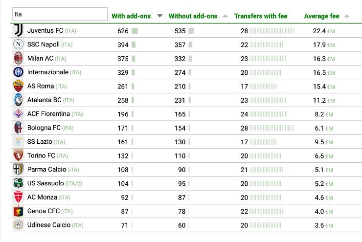 Tra le 100 squadre più spendaccione ce ne sono altre 9 italiane: Fiorentina, Bologna, Lazio, Torino, Parma, Sassuolo (attualmente in Serie B), quindi Monza, Genoa e Udinese. Queste ultime sono sotto i cento milioni di euro spesi.