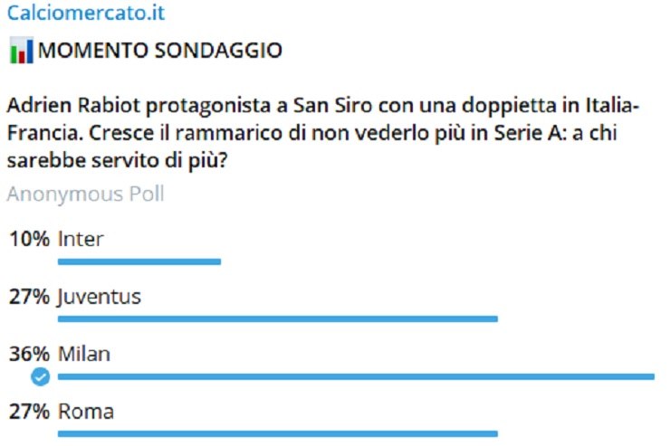 Tanti tifosi del Diavolo presenti a San Siro e davanti alla tv, e forse anche la dirigenza, hanno osservato la sua prestazione con rammarico. Nel sondaggio indetto dalla redazione di Calciomercato.it sul suo canale Telegram, è stato il Milan a vincere come squadra che avrebbe avuto più bisogno dell’ex bianconero, con il 36% dei voti. Davanti proprio alla Juventus e alla Roma, con il 27% delle preferenze. Poco considerata l’ipotesi Inter (10% dei voti), vista la mediana di altissimo profilo di cui i nerazzurri possono disporre.