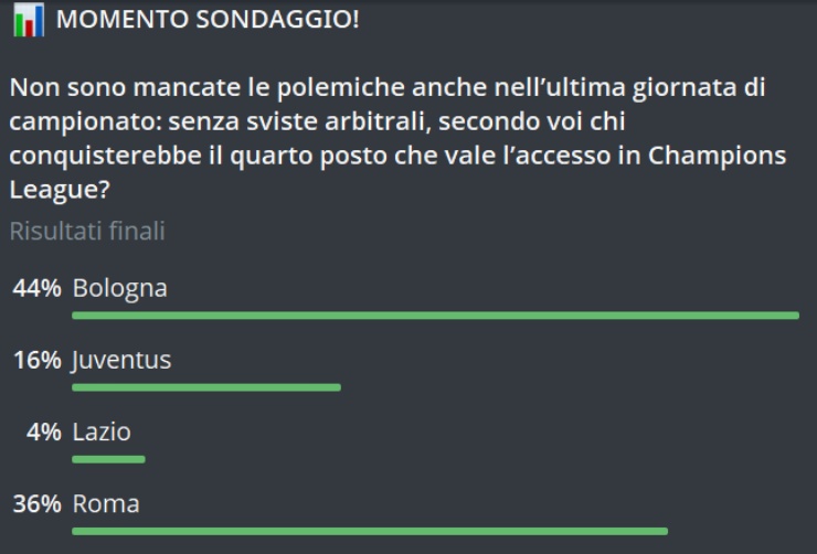 L’opzione più votata è stata invece il Bologna: per il 44% dei nostri utenti, è la formazione rossoblù di Italiano quella che, in mancanza di errori arbitrali, si sarebbe qualificata/si qualificherebbe alla Champions 2025/2026. In sostanza chiuderebbe la stagione al quarto posto.