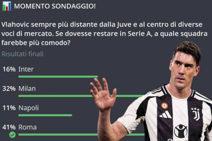 Il sondaggio Telegram, come si evince dallo screen in alto, è stato vinto dalla Roma, a caccia anch’essa di un nuovo centravanti. Col 41% dei voti, i giallorossi hanno sconfitto il Milan (32%) e l’Inter (16%).