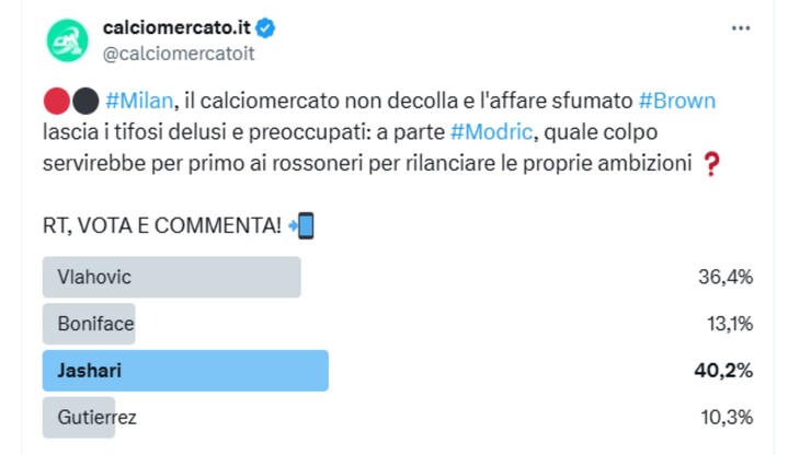 E i risultati portano ad Ardon Jashari. Il centrocampista svizzero è corteggiatissimo dal Milan. Il Club Brugge non vuole scendere sotto i 35 milioni di euro di parte fissa, anche se il calciatore ha già fatto sapere di volere solo i rossoneri. E proprio forte della volontà dello svizzero, il Milan non vuole fare rilanci, anche se dalla società belga è arrivata una chiusura con le parole del ds Rigaux. Il giocatore elvetico comunque è considerato il nome giusto per rilanciare le ambizioni rossonere ed è stato votato dal 40,2% dei votanti.