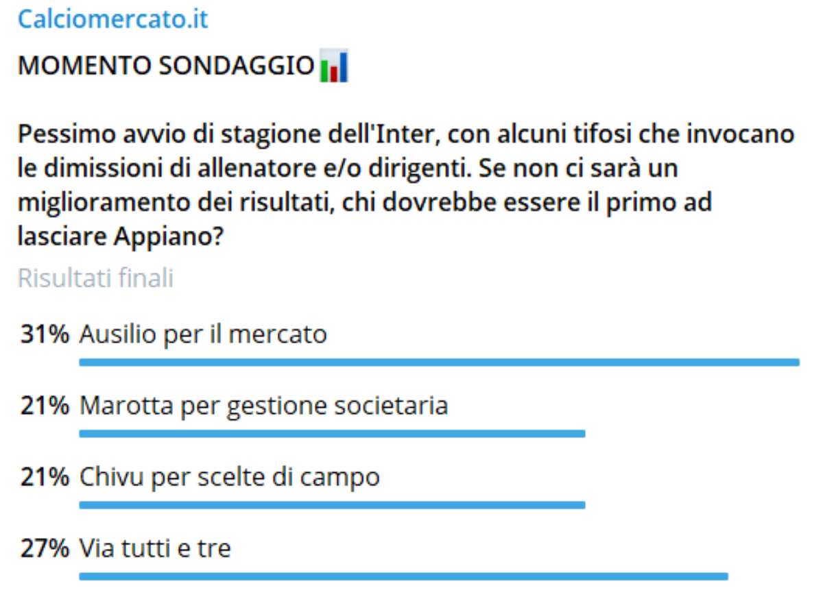 Alcuni sostenitori nerazzurri invocano addirittura le dimissioni di allenatore e/o dirigenti. Se non ci sarà un miglioramento nei risultati, chi dovrebbe essere il primo ad lasciare Appiano? Lo abbiamo chiesto ai nostri utenti nel sondaggio di CM.IT.